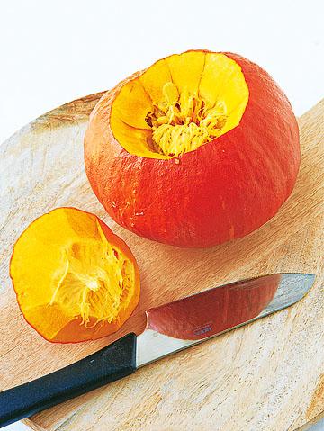1. Возьми маленькую, но обязательно устойчивую тыкву и аккуратно вырежи по кругу верхнюю часть (как на фото).