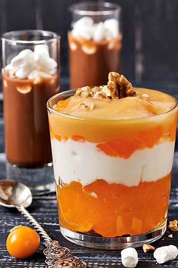 Нижний слой – порезанные плоды физалиса. Средний – сыр маскарпоне, взбитый со сметаной и сахаром. Верхний – пюре из физалиса. Декор – грецкий орех.