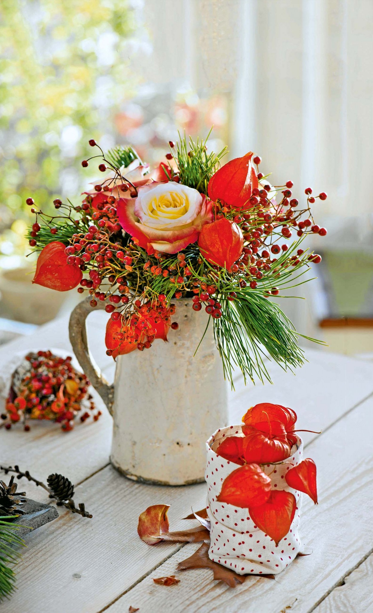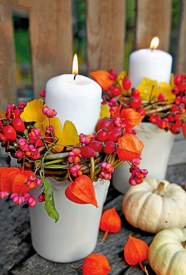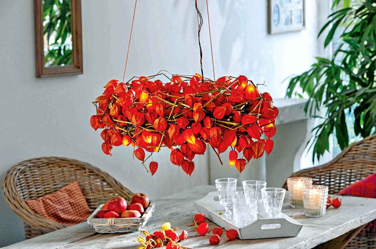 С помощью проволоки закрепи ветки физалиса на круглой основе. Такую композицию можно подвесить под абажуром или закрепить на двери, как рождественский венок.