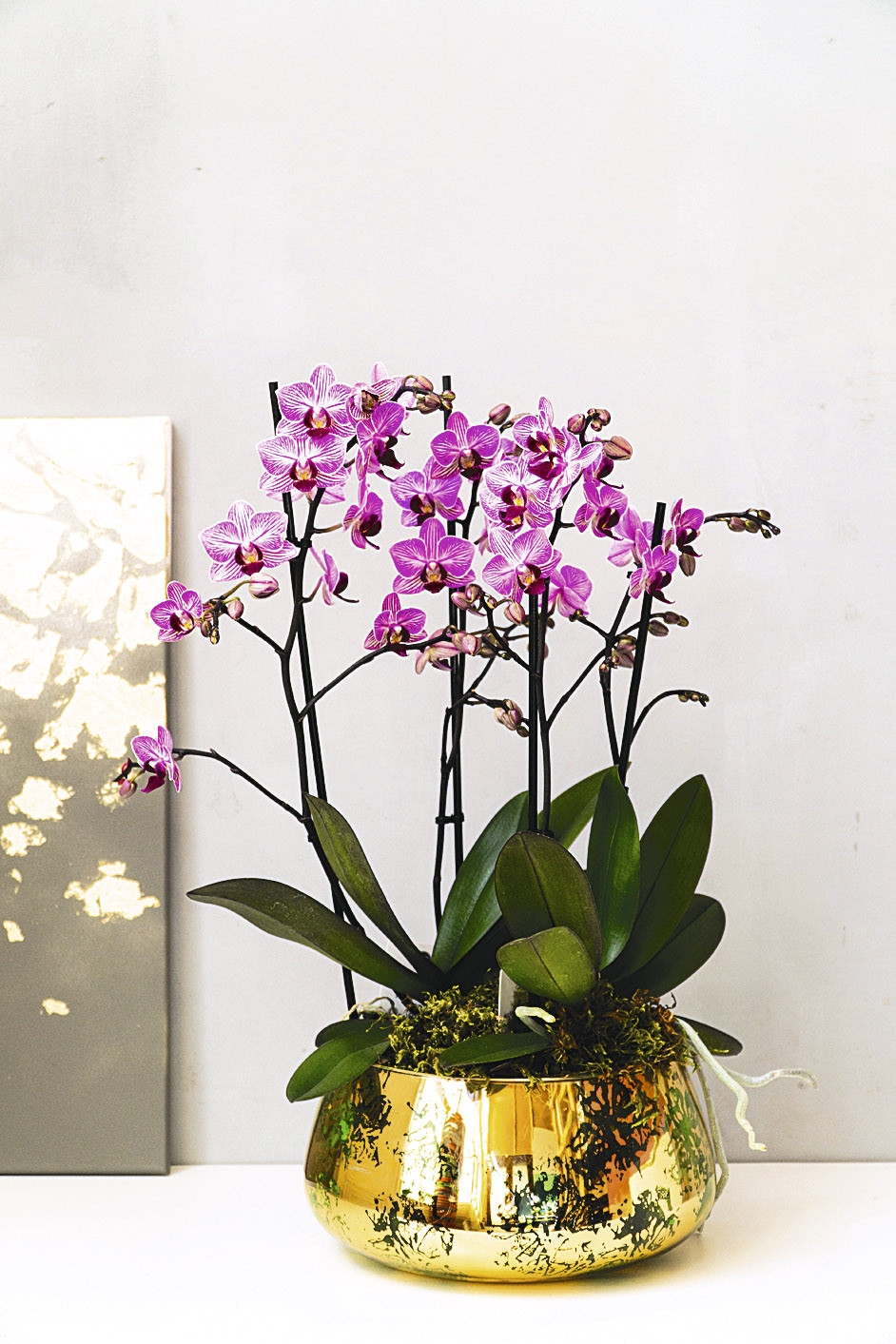 Композиция из орхидей сама по себе выглядит красиво за счет пышных розовых соцветий. Можно усилить эффект: в одну емкость высади сразу несколько растений.