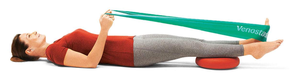 Ляг на спину, подложи под голени подушку или валик. Поочередно подтягивай колени к груди, сгибая и разгибая ноги. Чтобы усилить эффект, можно использовать эластичную ленту.