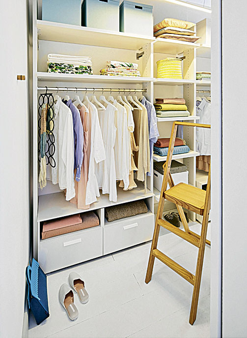 Классический вариант – когда шкаф совмещает в себе отделение со штангой и полки для хранения трикотажа. Также шкаф может быть оснащен выдвижными ящиками или корзинами. Корзины удобны еще и тем, что вещи в них проветриваются. Кроме того, в шкафу могут быть вешалка для галстуков и брюк, держатель для ремней и украшений, различные органайзеры для хранения мелочей.