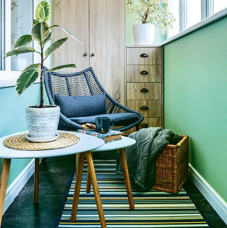 Это очень удобно для узкого вытянутого балкона. Здесь важна лаконичность. Если добавить больше мебели и декора, разместить подставки для комнатных растений и повесить настенный декор, лоджия будет выглядеть интереснее и эстетичнее на фотографиях, но в реальной жизни ты не сможешь легко по ней перемещаться. Чтобы превратить балкон в дополнительный уголок для отдыха, поставь одно или пару кресел и небольшой столик. Можно дополнить композицию миниатюрным пушистым ковриком: тогда в промозглую погоду не будут мерзнуть ноги.