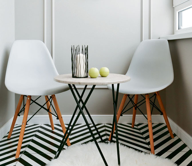 Еще один прием, который поможет преобразить балкон визуально, – красивое напольное покрытие. Полы можно сделать яркими или подобрать для них необычный узор. В холодный сезон, когда за окном серость, подобная отделка сделает лоджию уютнее и интереснее. Есть два способа оформить таким образом полы на балконе: еще на этапе ремонта подобрать подходящую плитку или положить поверх уже имеющегося покрытия декоративное, которое продается в виде квадратов и собирается по принципу мозаики.