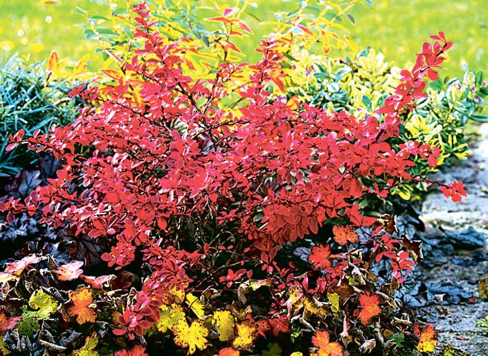 Этот вид барбариса имеет ярко-красные, почти пурпурные дугообразные ветви. Листья в форме ромба, заостренные, с приходом осени цвет меняется с красного на фиолетовый. В средней полосе расцветает в мае, цветы белые или красноватые.