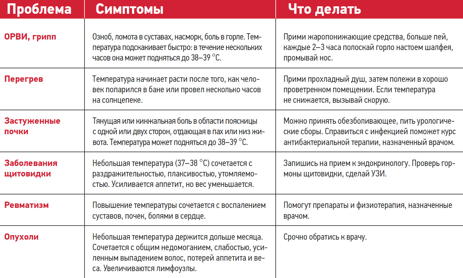 Поэтому она часто сопровождает простудные недуги, детские инфекции, заболевания дыхательных путей. Но могут быть и другие причины повышения температуры тела (или, как ее называют медики, гипертермии) – от элементарного перегревания до стресса (см. нашу таблицу «Почему поднялась температура»).