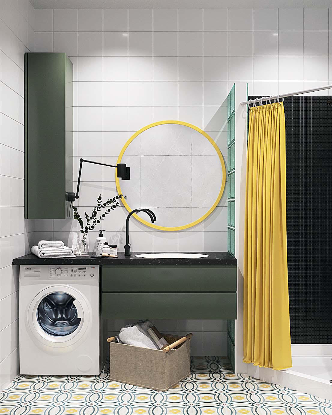 Если ты намерена обновить интерьер ванной комнаты, обрати внимание на текстиль и аксессуары. Эффектный и быстрый способ – новая шторка актуального цвета и поддержка этого оттенка, к примеру, в раме зеркала. Яркий и необычный цвет «Нарцисс» – отличный способ создать оптимистичные акценты в монохромном оформлении. Подобная изюминка не помешает даже такому техническому помещению, каким, по сути, является санузел.