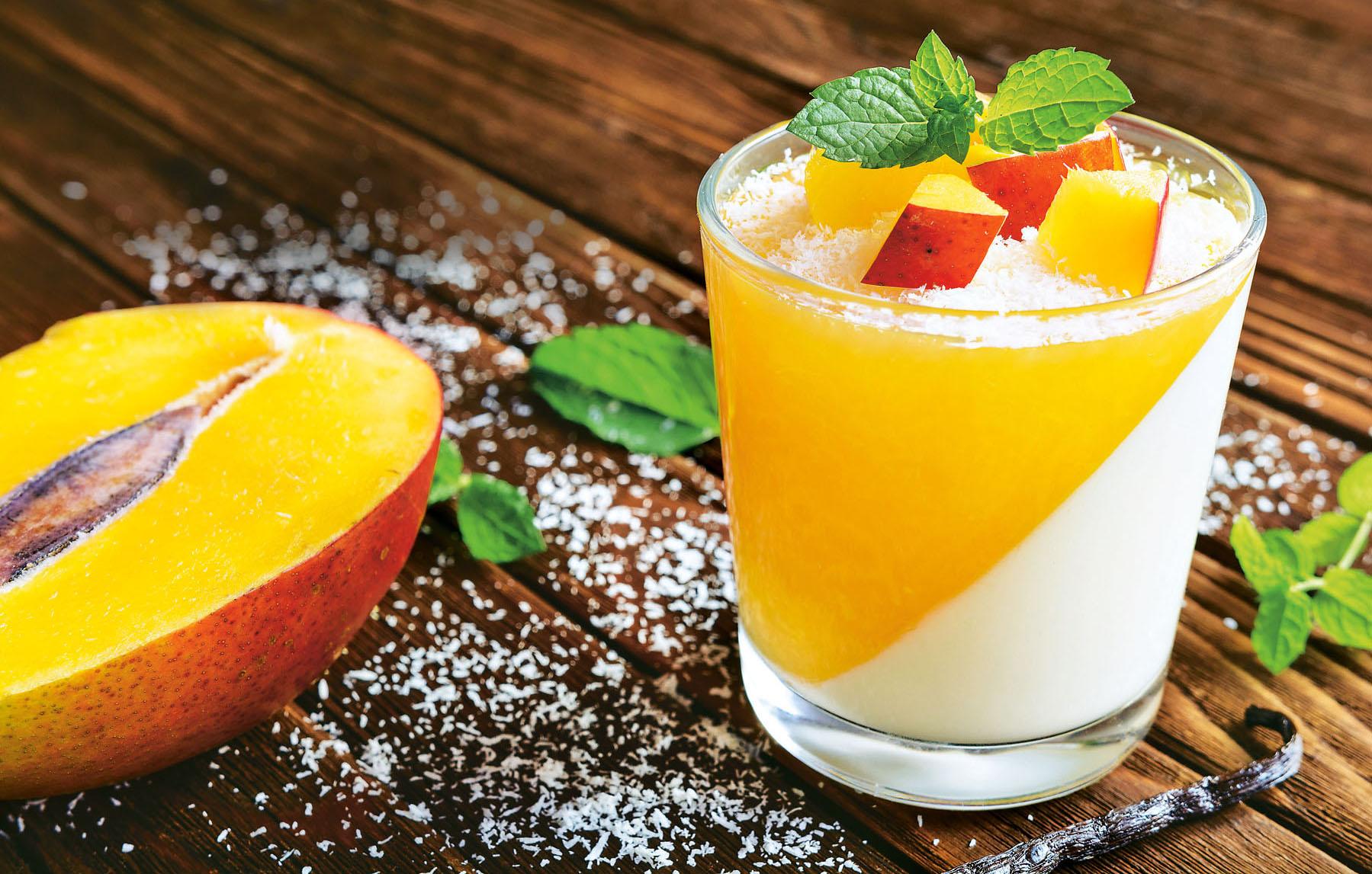 На 4 порции: • 20 г желатина • 400 г сливок (жирность 10%) • 200 мл кокосового молока • 1 стручок ванили • 100 г белого шоколада • 500 г мякоти манго • 1 ч. л. сока лайма • 1 ч. л. ванильного сахара