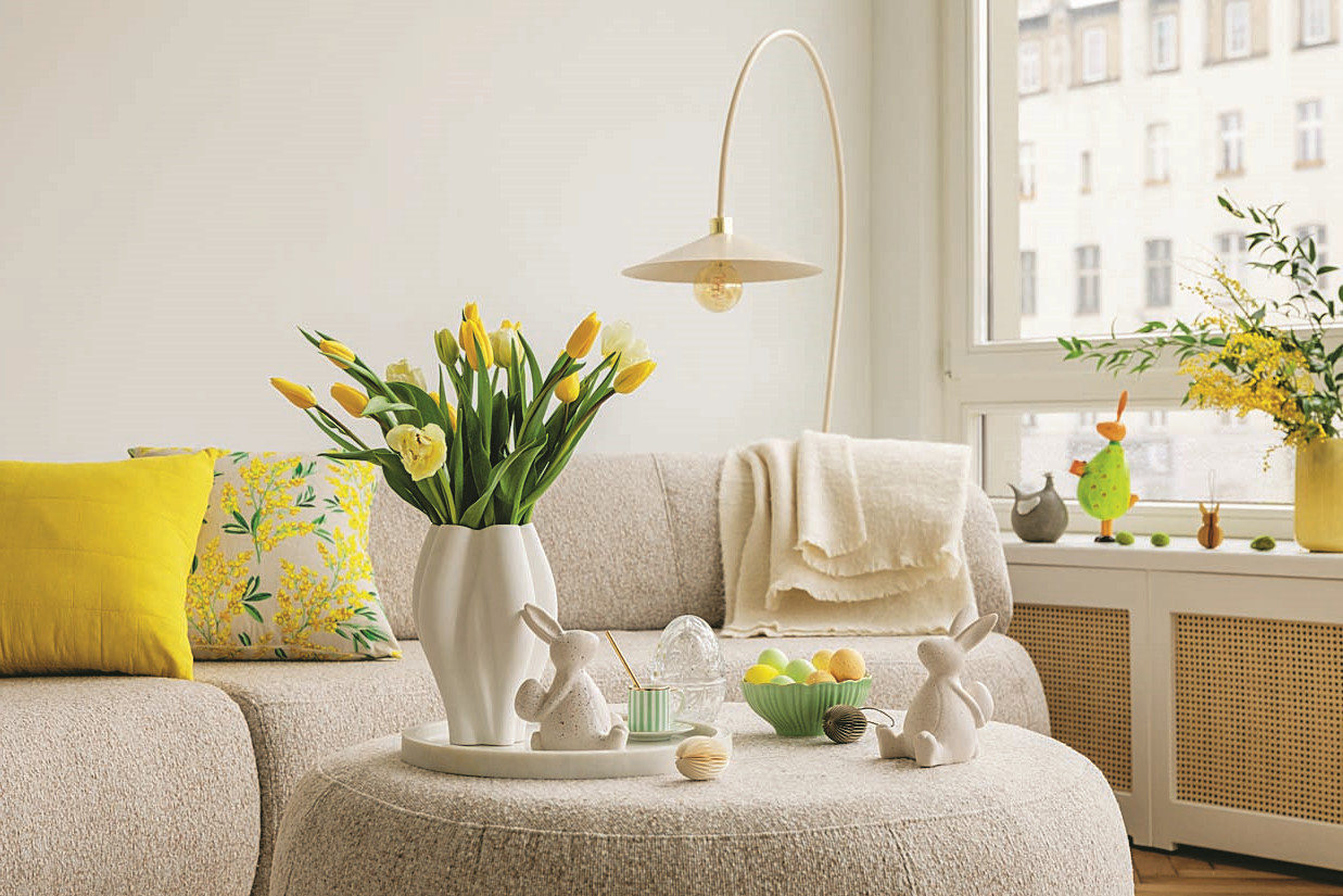 Пасхальное настроение в доме можно создать с помощью тематических деталей из текстиля. Например, декоративных подушек с изображением символа праздника – кролика, или с цветочным принтом.