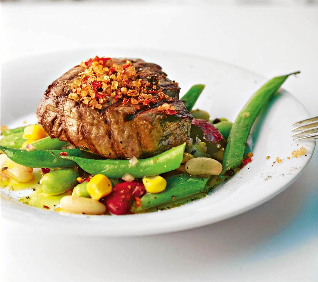 Приготовление: мясо слегка отбей, посыпь специями и сбрызни растительным маслом. Обжарь стейк на сковороде-гриль сначала с одной стороны в течение 20 секунд, потом – с другой, чтобы все соки остались внутри. Убавь огонь до среднего и продолжай жарить стейк еще 10–15 минут (в зависимости от степени прожарки, которую предпочитаешь). Подавай стейк с гарниром из отварной или тушеной стручковой и цветной фасоли.
