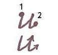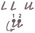 Буква состоит из двух элементов: сначала из точки 1 пишется первый, потом из точки 2 второй.