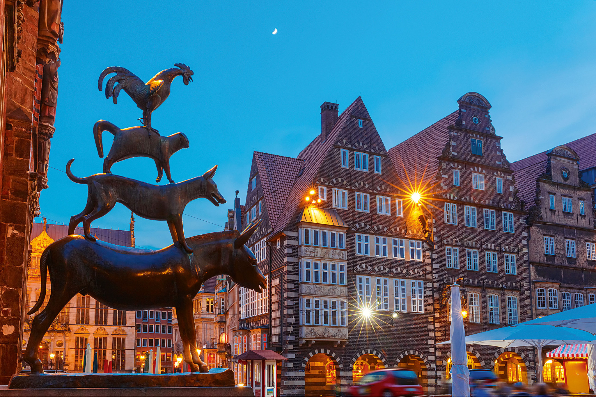 «Дорога сказок» заканчивается в Бремене, который прославил квартет необычных музыкантов: осел, пес, кот и петух. Возле городской Ратуши им установлен памятник. Согласно примете, чтобы вернуться в Бремен, нужно погладить ногу осла.