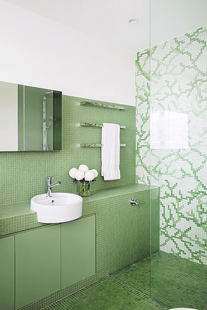 - Цветной камень. Он приходит на смену сдержанному белому и серому мрамору, которым сейчас перенасыщены интерьеры ванных. Натуральный или искусственный камень в зеленых, синих, коричнево-рыжих тонах применяют для облицовки стен, полов, столешниц и даже раковин.