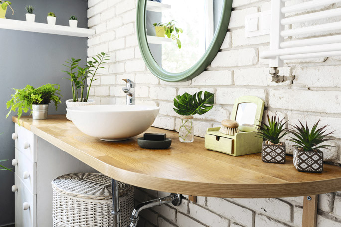 - Используй натуральные материалы – покрытое влагостойкими средствами дерево, камень, керамику.