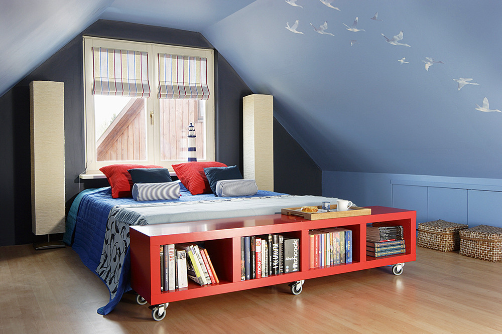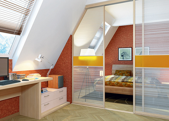 Есть два самых популярных варианта использования низких мест под скосами крыши. Первый — поставить там невысокую мебель, например, кровать, второй – оборудовать в этих зонах системы хранения. Самый простой вариант зонировать пространство – установить двери-купе из трех полотнищ. Одно из них по форме должно напоминать трапецию, в которой нижняя часть параллельна полу, а верхняя повторяет форму скошенной крыши мансарды. За такой перегородкой можно легко спрятать как спальню зону, так и зону хранения.