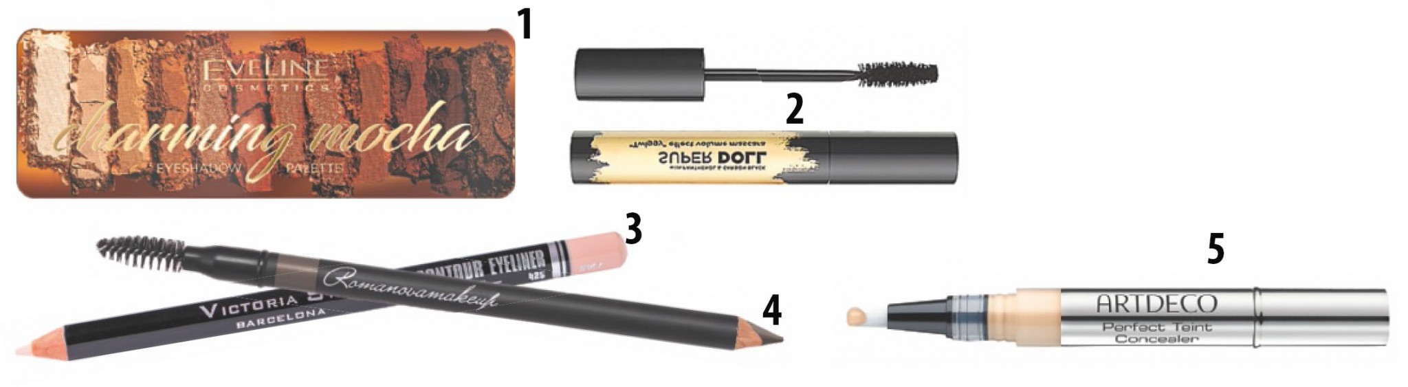 Нанеси на подвижное веко, выходя за складку, светлые тени. Не закрывая глаз, примерно от середины и до внешнего края века, растушуй по складке бежевые тени. Закончи макияж тонкой длинной стрелкой и черной объемной тушью в два слоя.