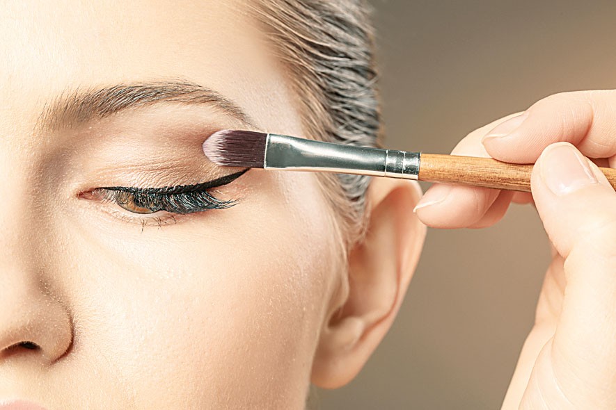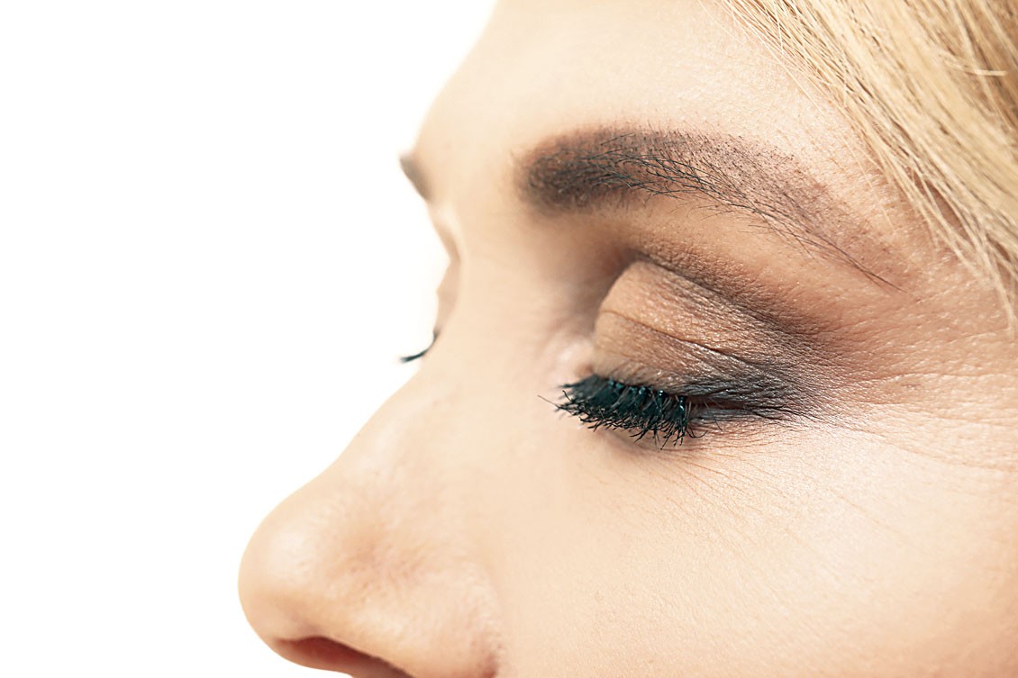 Используй только матовые тени: перламутр забивается в морщинки! На подвижное веко нанеси тени на два тона темнее цвета кожи. Во внешних уголках растушуй черные тени движениями вверх и в сторону. Нижнее веко не подводи и не прокрашивай тушью.