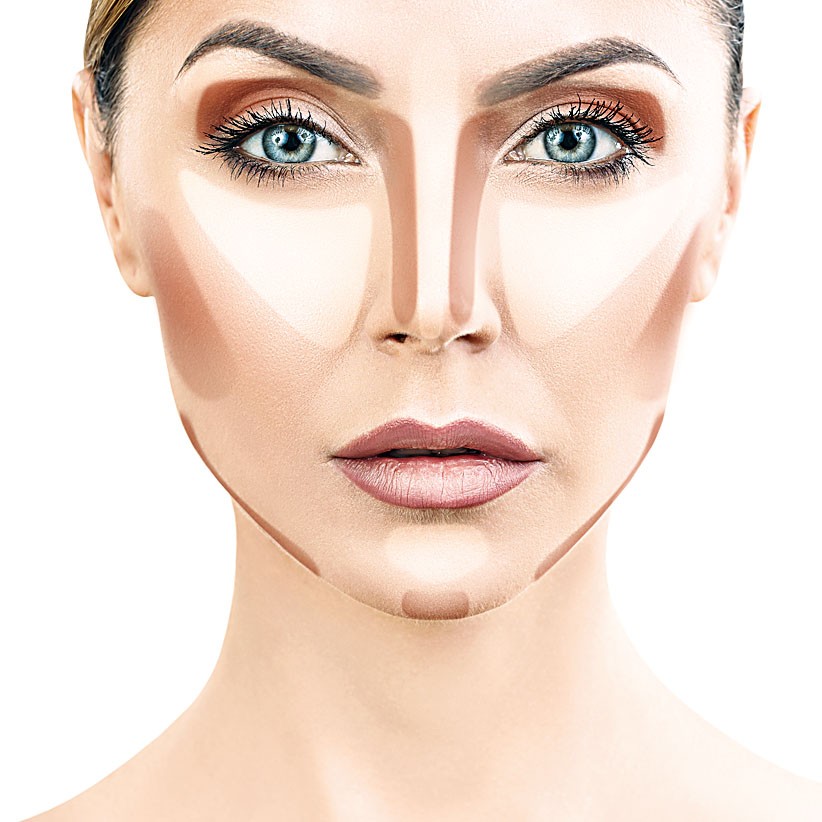 Возьми пудру для контуринга с двумя оттенками: светлым и в тон кожи. Светлым нарисуй треугольник под глазами, заходя одной стороной на мешок. Темным оттенком проведи линии под скулой. Сверху обязательно нанеси плотный тон.