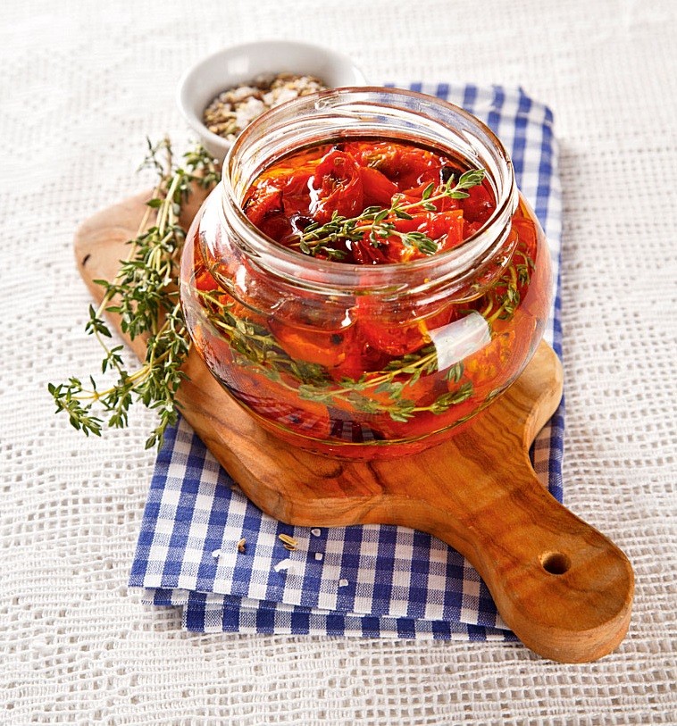 НА БАНКУ 0,3 Л: •1 кг сливовидных помидоров •3 ст. л. оливкового масла •1 ст. л. сахара •сушеный тимьян и соль по вкусу