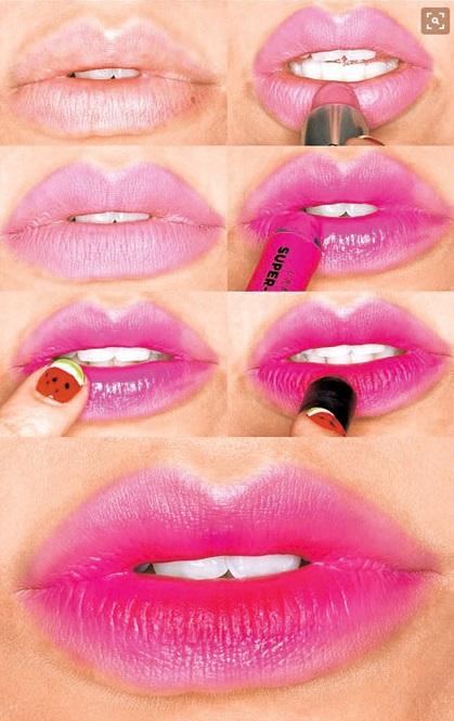 Припудри губы и нанеси, выходя за контур, нежно-розовую помаду. Затем только в центр обеих губ – ярко-розовую. Растушуй ее пальцем и нанеси еще раз только на нижнюю губу.