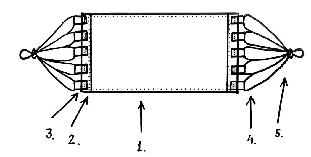 4. Ну и пришла пора сделать веревочное крепление! Понадобится 18 отрезков жгута (по 1,2 метра каждый). Продень отрезки через петли и получишь двойную длину в 60 см.