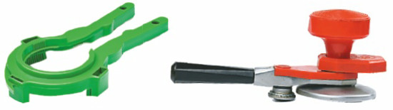 Это устройство представляет собой закаточную машинку с горизонтальной и вертикальной ручками, предназначенными для удержания и закрутки крышек. На фиксаторе есть резьба, по которой движется механизм, прочно прижимая металл к стеклу. Для закрутки с помощью такой машинки-полуавтомата достаточно установить устройство и провернуть до упора.