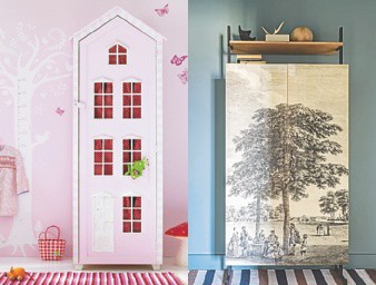 Шкаф в детской может стать элементом декора. Например, если оформить его в виде уютного домика, а рядом, на ветке нарисованного на стене дерева, закрепить крючок для одежды. Главные преимущества открытого хранения – визуальная доступность вещей и экономия места. Чтобы стеллаж выглядел эстетично, используй стильную декоративную ширму.