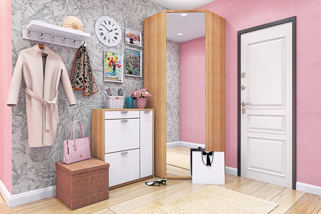 Угловой шкаф может визуально увеличить пространство небольшой прихожей, если разместить на его передней панели зеркало. Главный плюс такого шкафа – вместительность. Недостаток – вряд ли удастся подобрать готовый, придется заказывать.