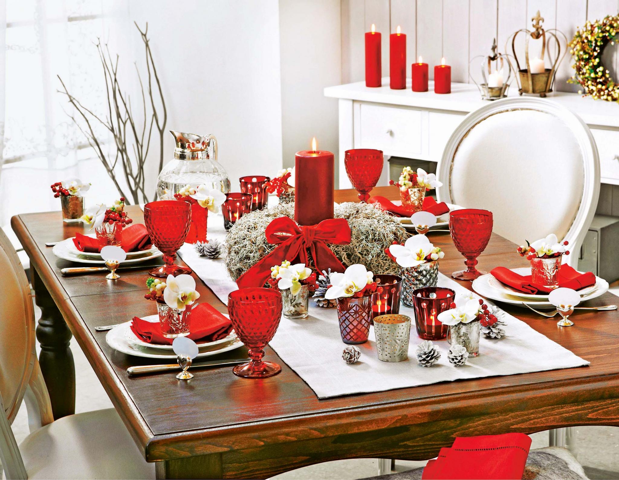 Цветы пуансеттии или веточки рябины – поставь их в мини-вазочки.