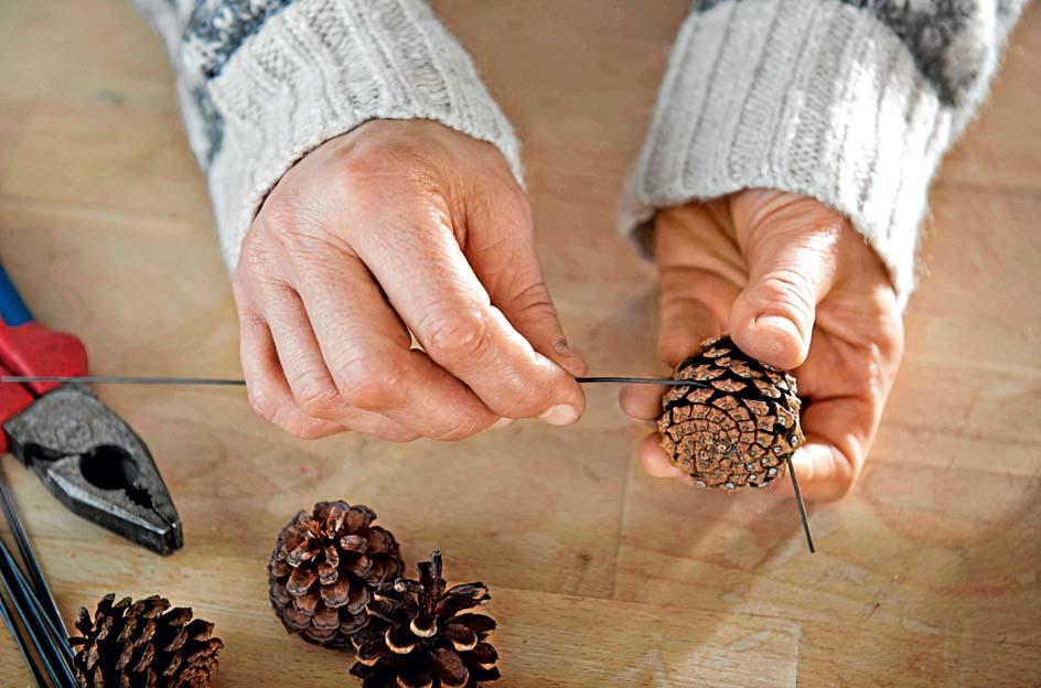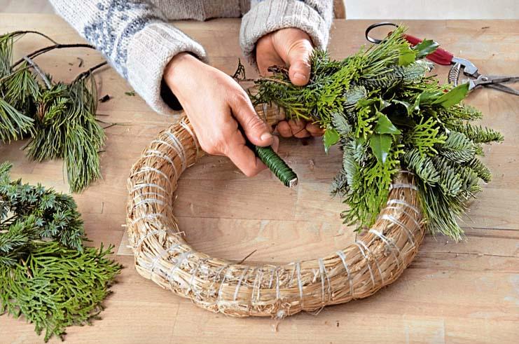 При помощи проволоки сделай венок из соломы, а далее постепенно (по кругу) примотай зеленые еловые ветки.