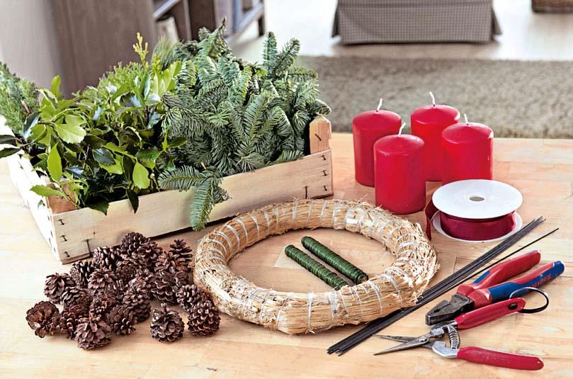 • Солома • Тонкая проволока • Веточки ели или туи • Свечи • Маленькие шишки • Красная атласная лента