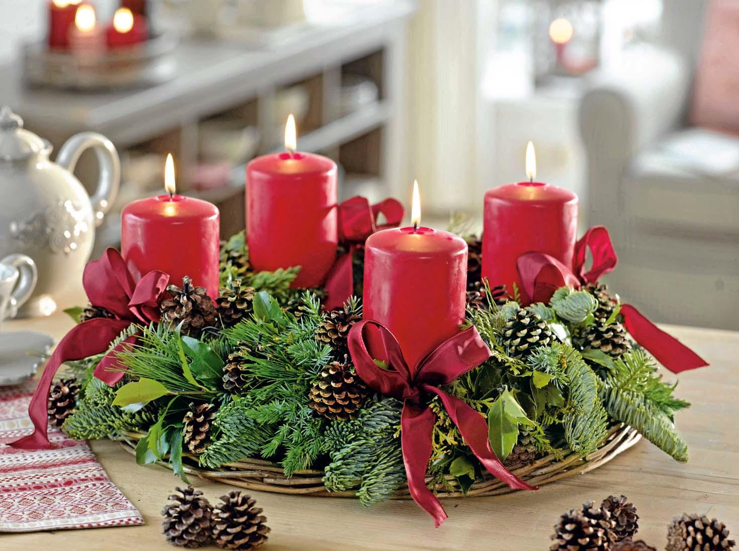Обмотай шишки проволокой и также прикрепи их к венку. Размести в середине композиции блюдо и поставь на него свечи, украшенные бантами из красной ленты.