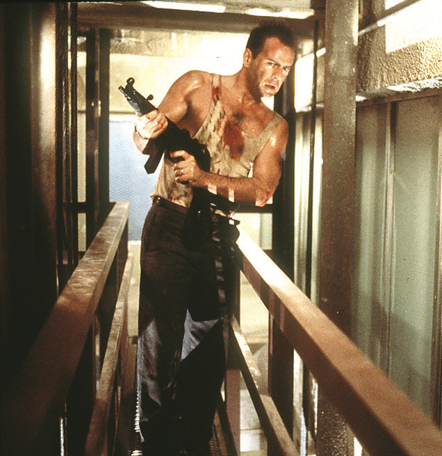 Уиллис голыми руками и босыми ногами расправляется с двадцатью террористами! Мужчины восхищаются, а женщины млеют от молодого Брюса, который умеет шутить с абсолютно непроницаемым лицом.