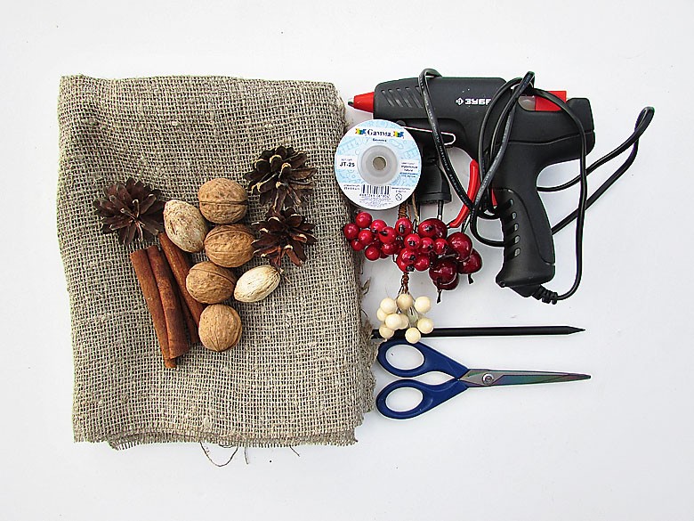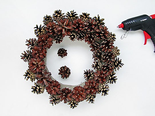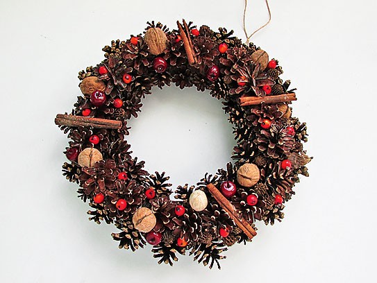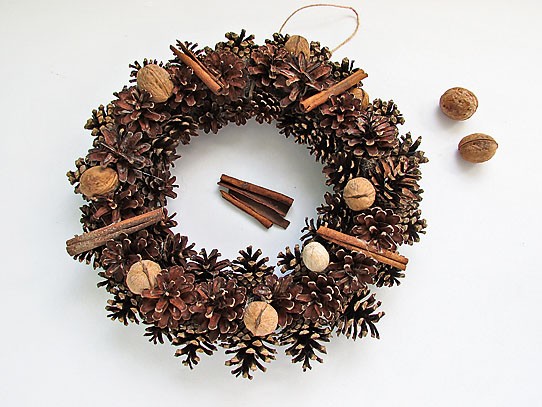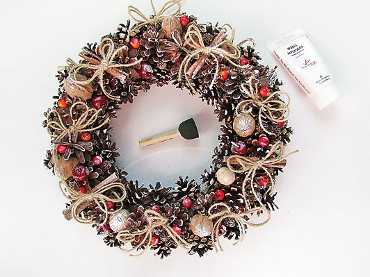 Пустые места между шишками и орехами заполни искусственными ягодами.