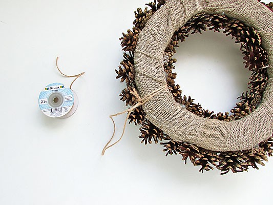Отрежь 30–40 см бечевки и сделай подвес для венка.