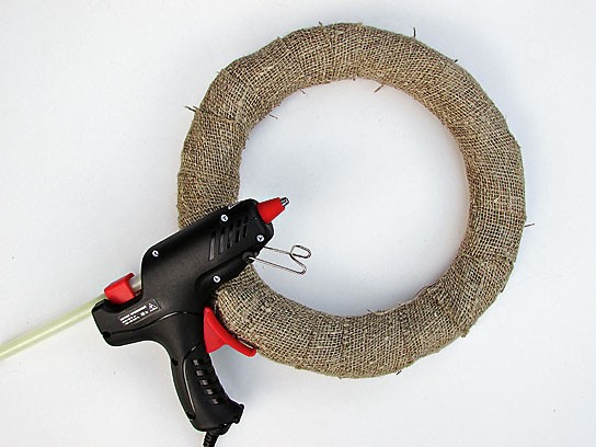 Нарежь мешковину на полосы шириной 10–15 см и обмотай каркас. Мешковину приклей к картону термоклеевым пистолетом.