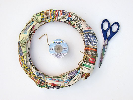 Сомни газеты, скручивая их в жгуты, и привяжи к картонному каркасу бечевкой, создавая объем.