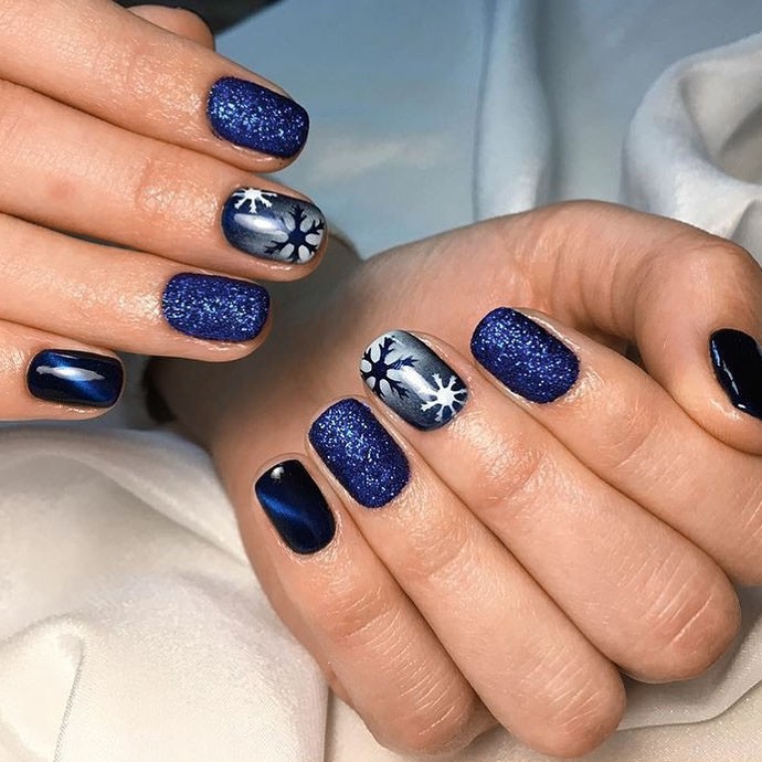 Очень эффектно смотрится на ногтях миндалевидной формы. При желании можешь добавить в оформление снежинок мелкие стразы.