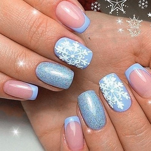 Проще и быстрее такой дизайн будет создать с клейкими трафаретами для френча и снежинок.