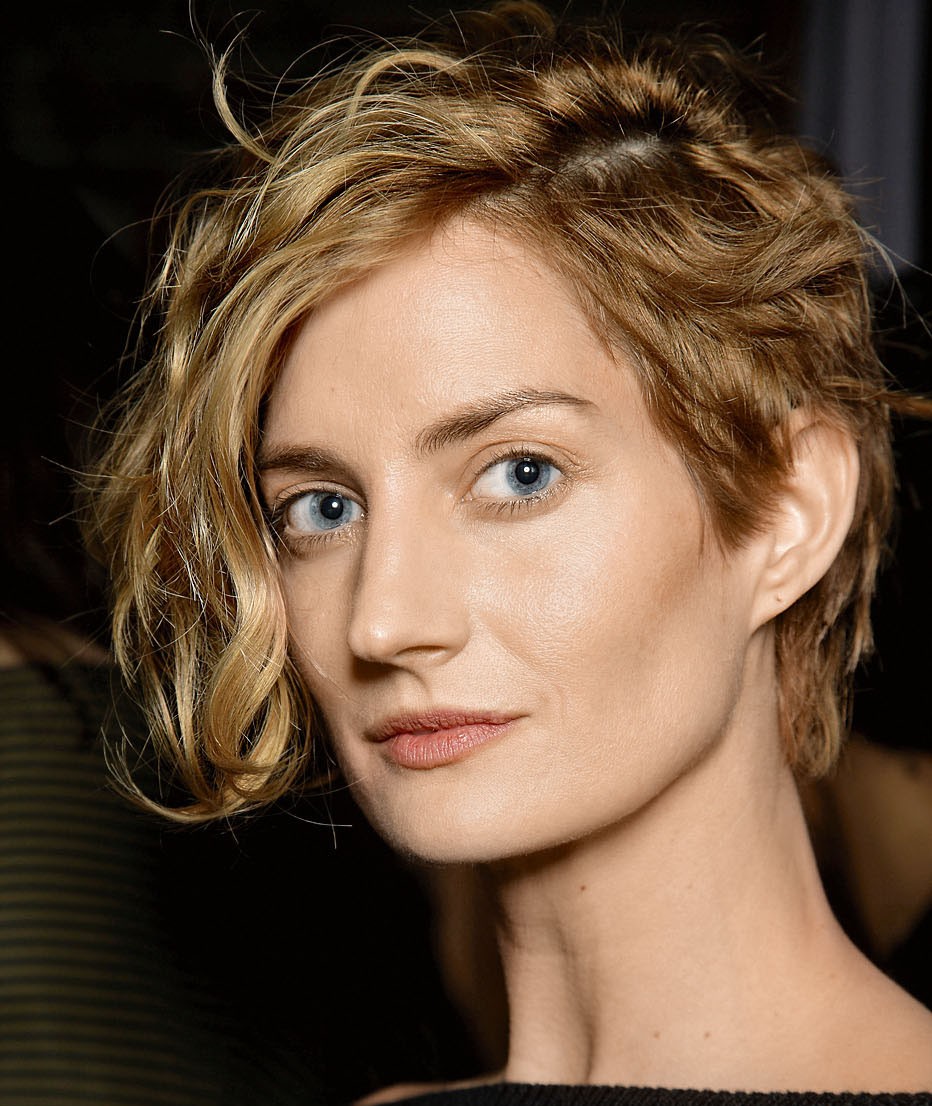 Завей тонкие прядки с помощью утюжка, меняя направление внутрь и наружу. Разбери локоны руками, не расчесывая, и уложи на косой пробор.