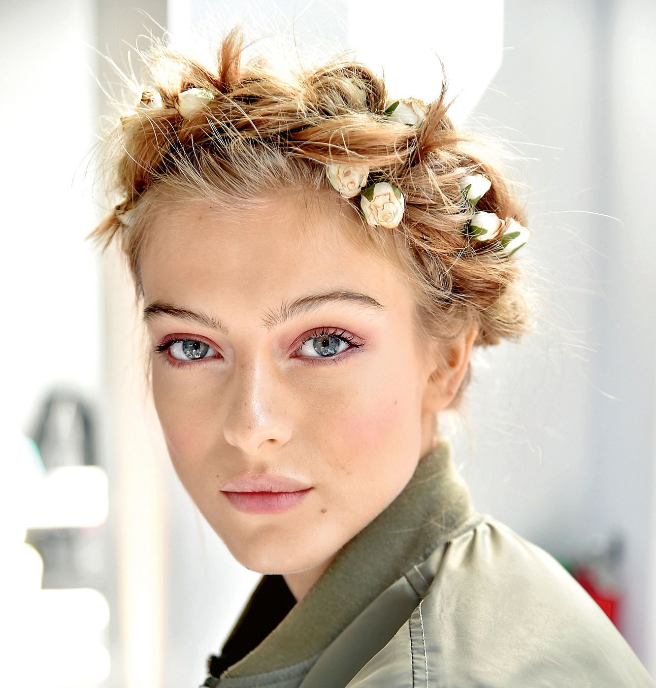 Заплети ободок на основе колоска. Растрепи отдельные звенья и заколи его невидимками с цветами.