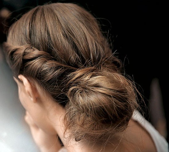 Скрути волосы валиками с двух сторон и собери их в низкий объемный пучок. Заколи шпильками.