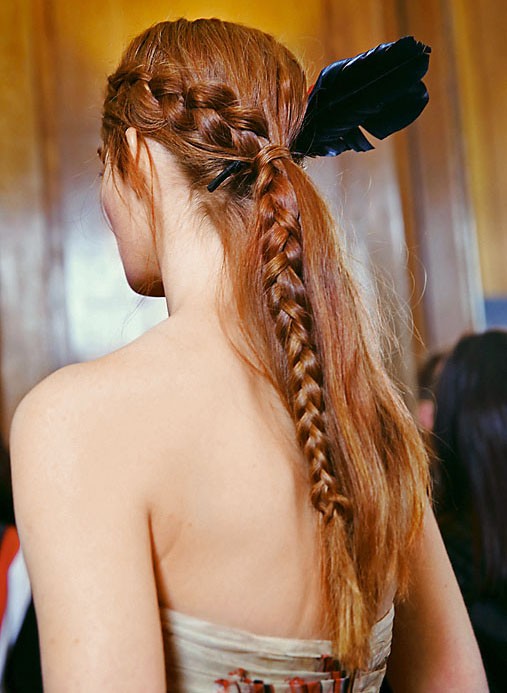 С одной стороны заплети колосок. Собери его в хвост на макушке и к резинке подколи перо.