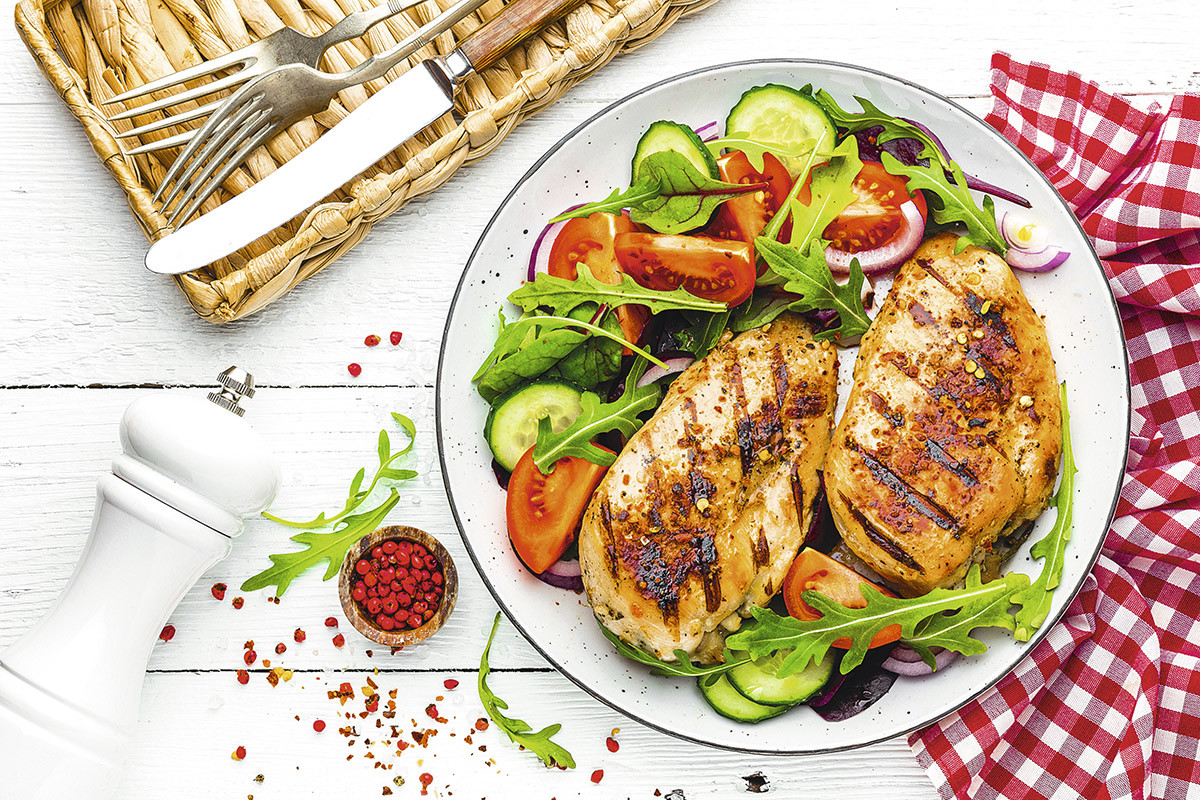 - Ужин: 2 ломтика баранины или свинины на гриле (65–100 г), отварная картофелина, 1 чашка листового салата, заправленного лимонным соком