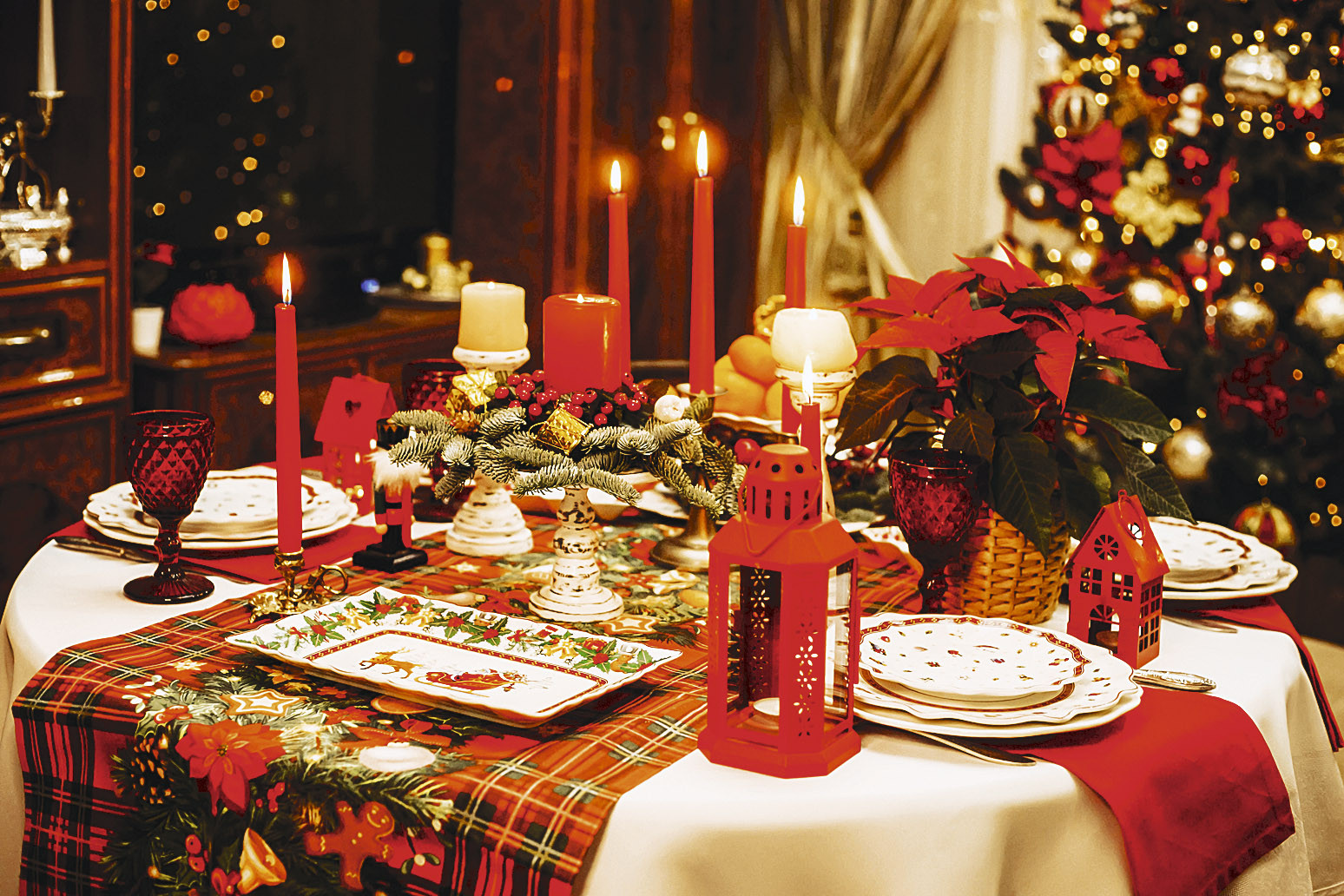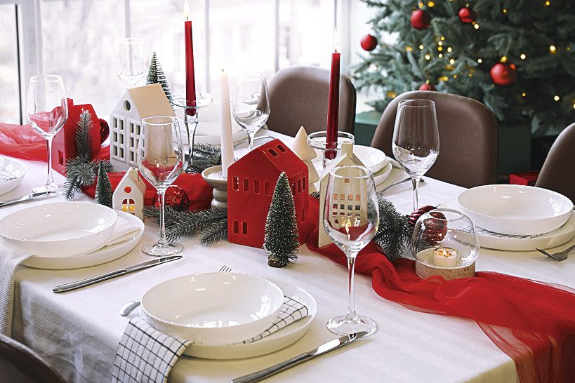 Символ 2024 года – Зеленый Деревянный Дракон, поэтому для украшения стола подойдут красный, зеленый (все оттенки, например, зелено-голубой) и золотой оттенки. Это традиционные цвета для новогоднего стола. Еще красный цвет, по преданию защищает от злых духов и привлекает благополучие в дом. Зеленый ассоциируется с началом новой жизни и ростом, а золотой – с денежным достатком. Все три цвета хорошо сочетаются между собой, и ты можешь использовать их вместе, или выбрать один главный. Например, скатерть и салфетки положи одного основного цвета. Красными вкраплениями станут веточки рождественских ягод, а ярким зеленым пятном – ваза в середине стола с живыми еловыми или сосновыми ветками. А предметы декора – столовые приборы, кайма на посуде и т.п. – могут быть золотистыми.