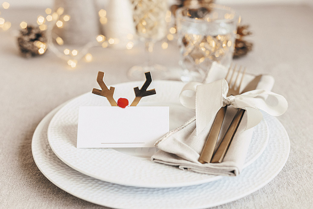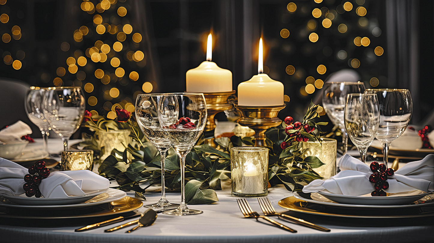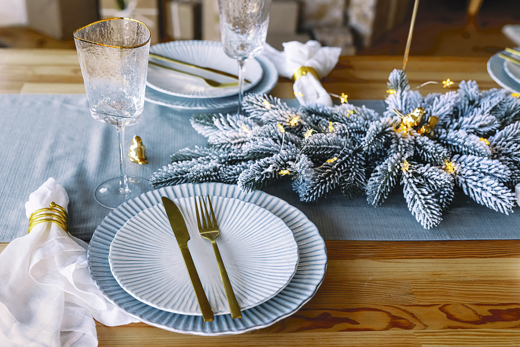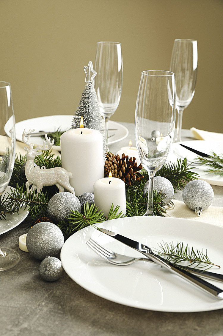 ✽ Посуду лучше выбрать однотонную белую и дополнить ее высокими фужерами из стекла. В центре стола поставь минималистичные подсвечники и небольшие вазочки с хвойными ветками.