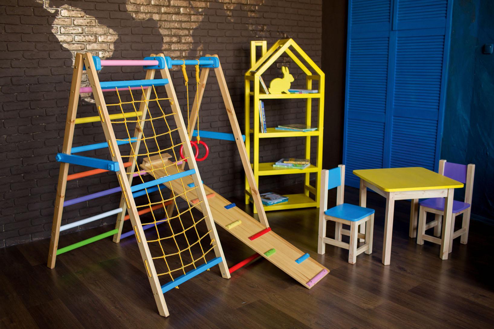 Напольные. Они наиболее мобильны, не имеют никаких креплений, при желании такой уголок можно перевезти на дачу, легко продать или подарить, если ребенок уже вырос. Чаще всего такие конструкции состоят из лесенок, горок, канатов и небольших качелей. Минус этого варианта – он может занимать около 2 м2 на полу, что нереально для маленькой комнаты.