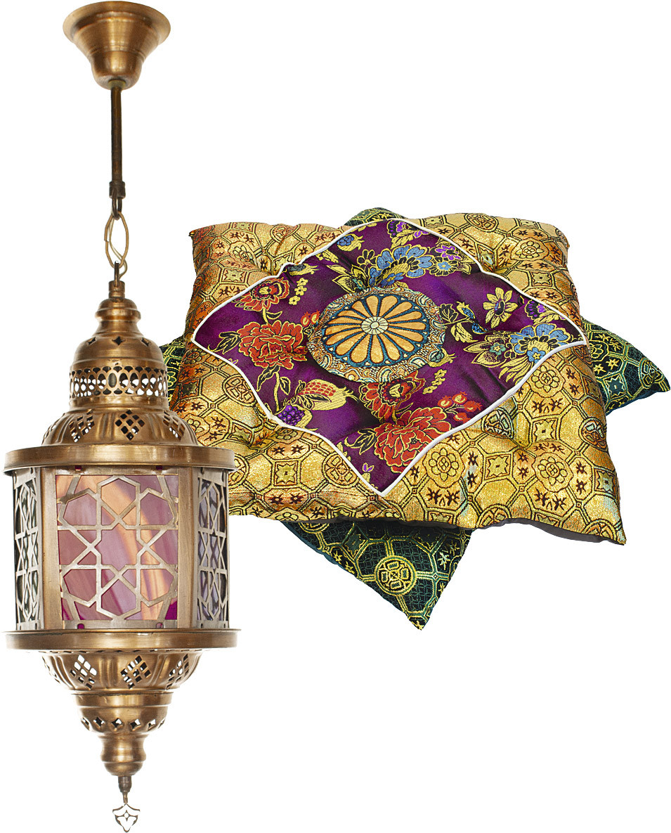 - накинь на самый обычный абажур платок с кистями или длинными нитями бисера, и он обретет совершенно восточный вид. Небольшие светильники из цветного стекла (красного, оранжевого) будут выгодно оттенять затейливые восточные узоры.