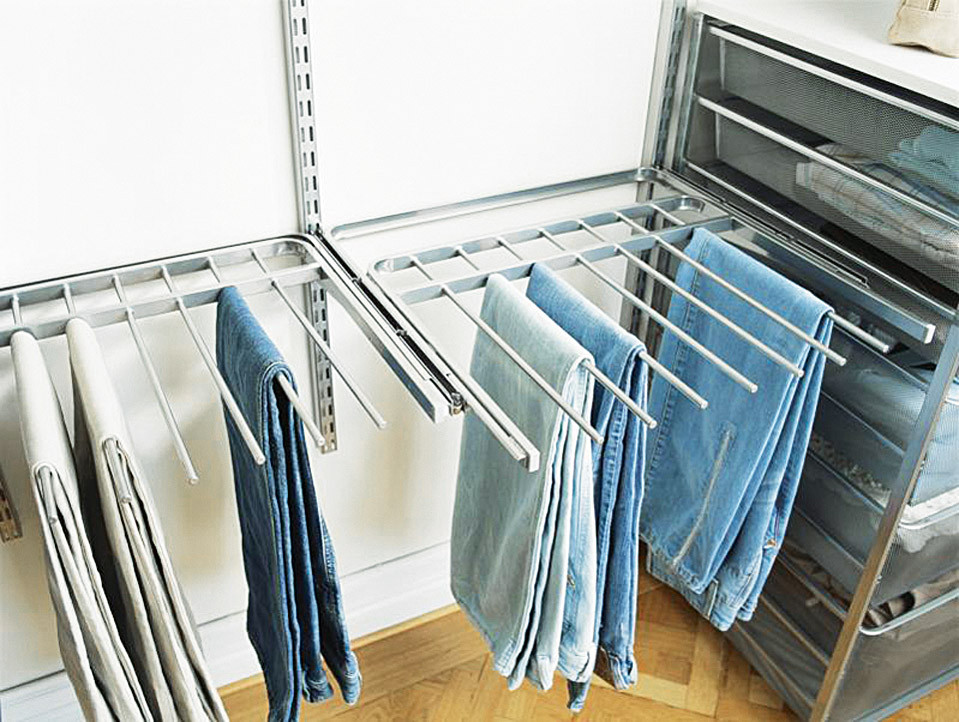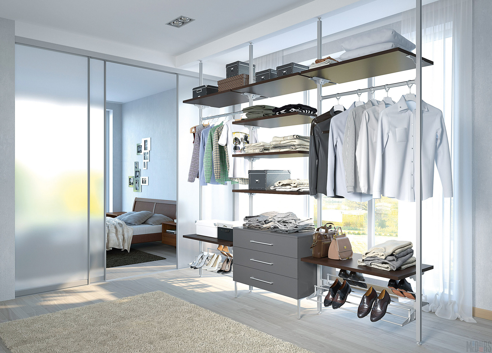 Стеллажная. Эта конструкция не занимает много места и позволяет рационально использовать все пространство от пола до потолка. Стеллажи оптимально вписываются даже в маленькие гардеробные, где нет места для открывания дверей шкафов или выдвигания ящиков. Существует много разновидностей стеллажных систем – с креплением на стестое нах, стойках, модульные и т. д.