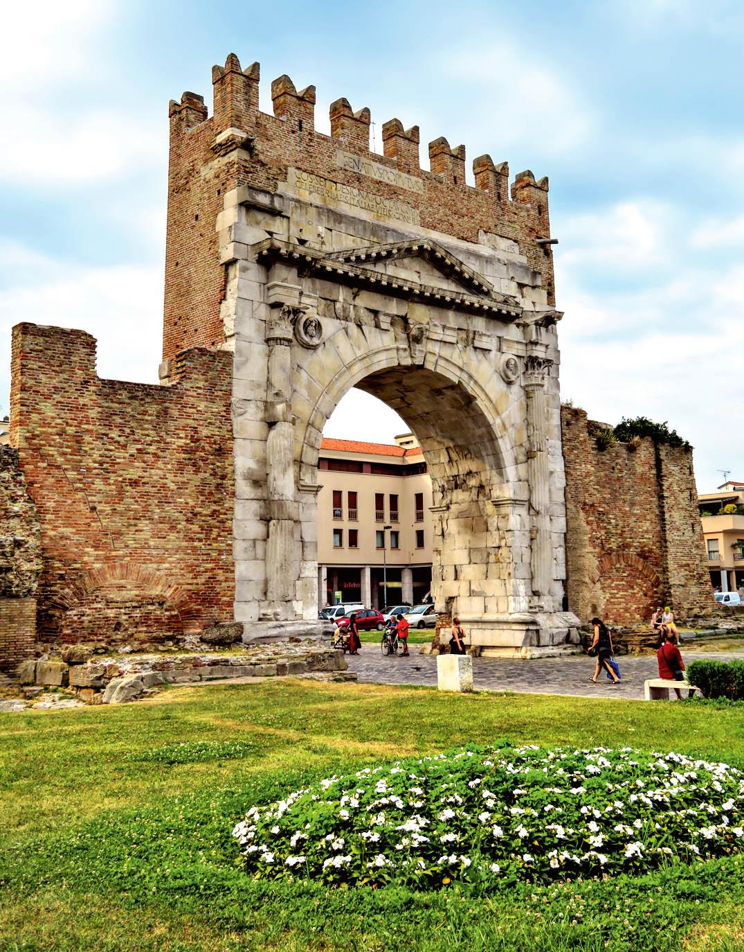 Арка Августа даже старше моста, но также стоит на прежнем месте, в начале улицы Corso d’Augusto. Сегодня это центр города, а когда-то арка служила воротами, конечным пунктом дороги, соединящей Рим с побережьем Адриатического моря.